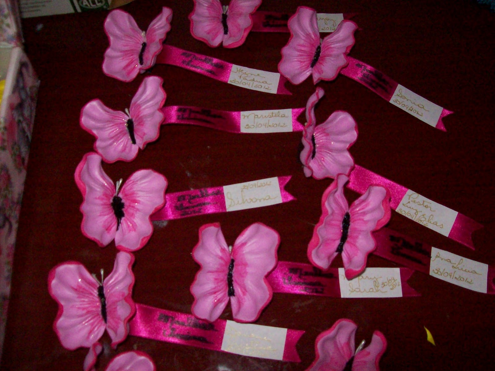 Usamos essas borboletas para reservar as mesas do Pastor Luiz Elias, da Professora e seus pastores e das formandas, um mimo.