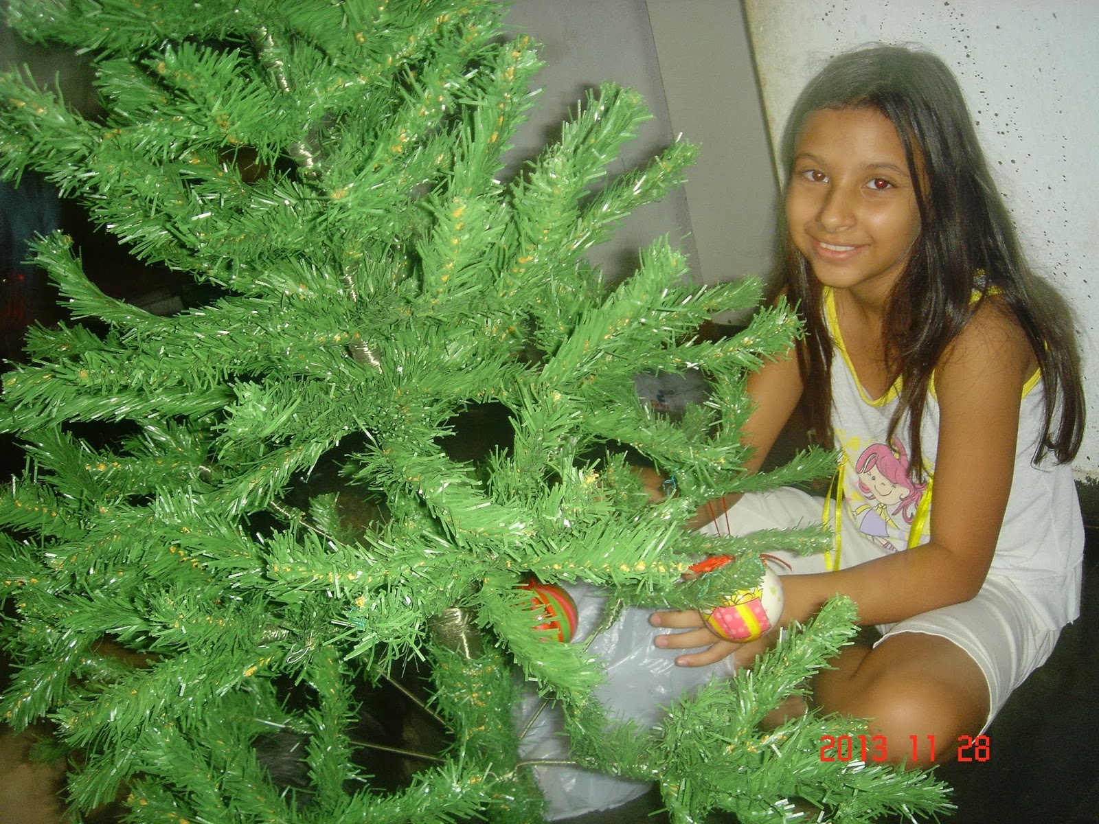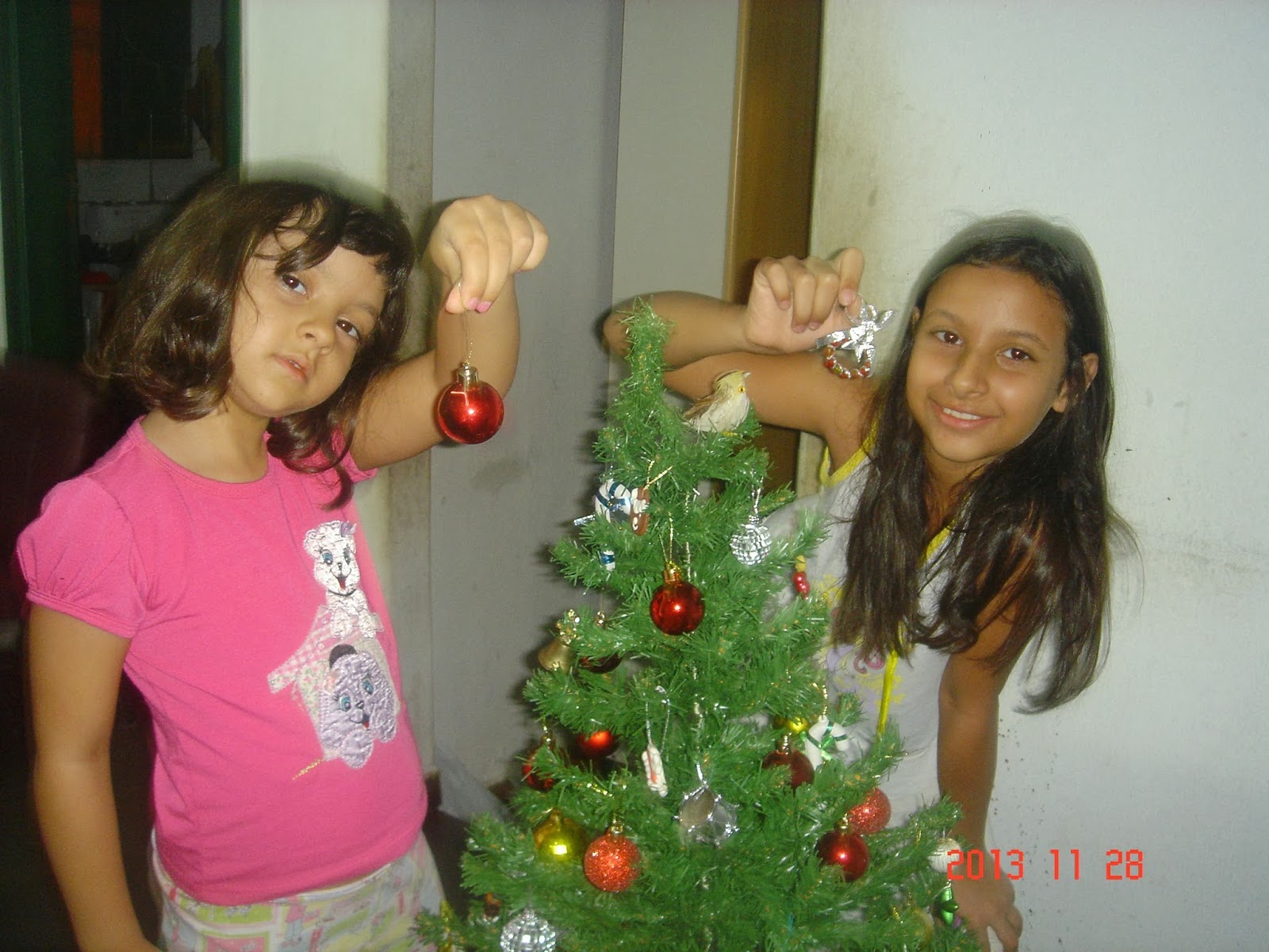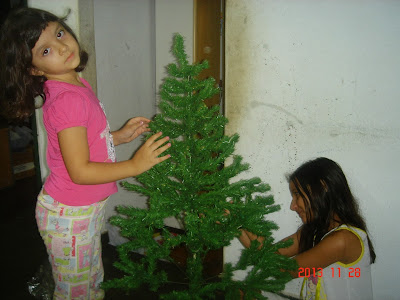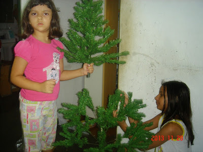As meninas montam a árvore e vão colocando os enfeites