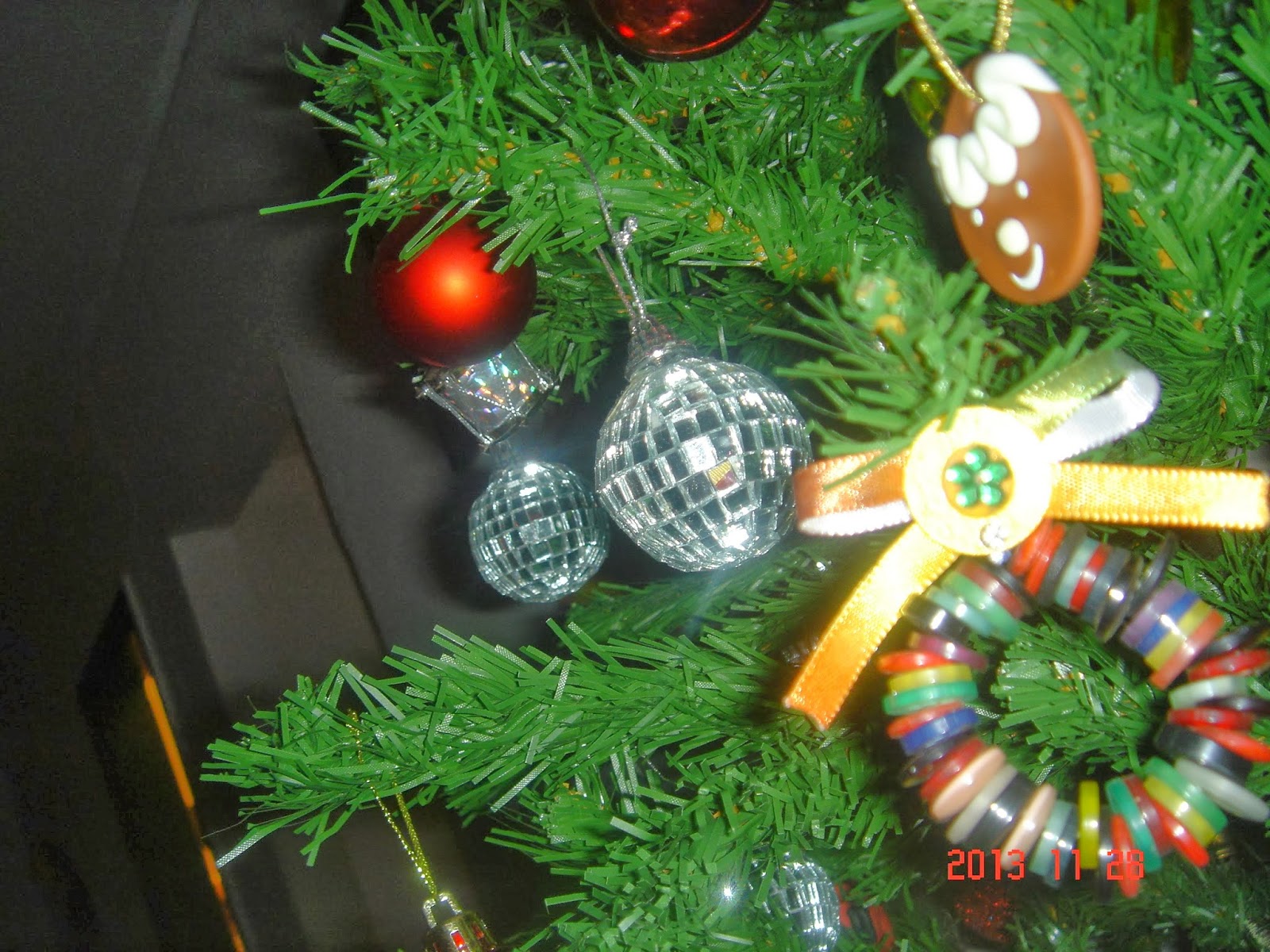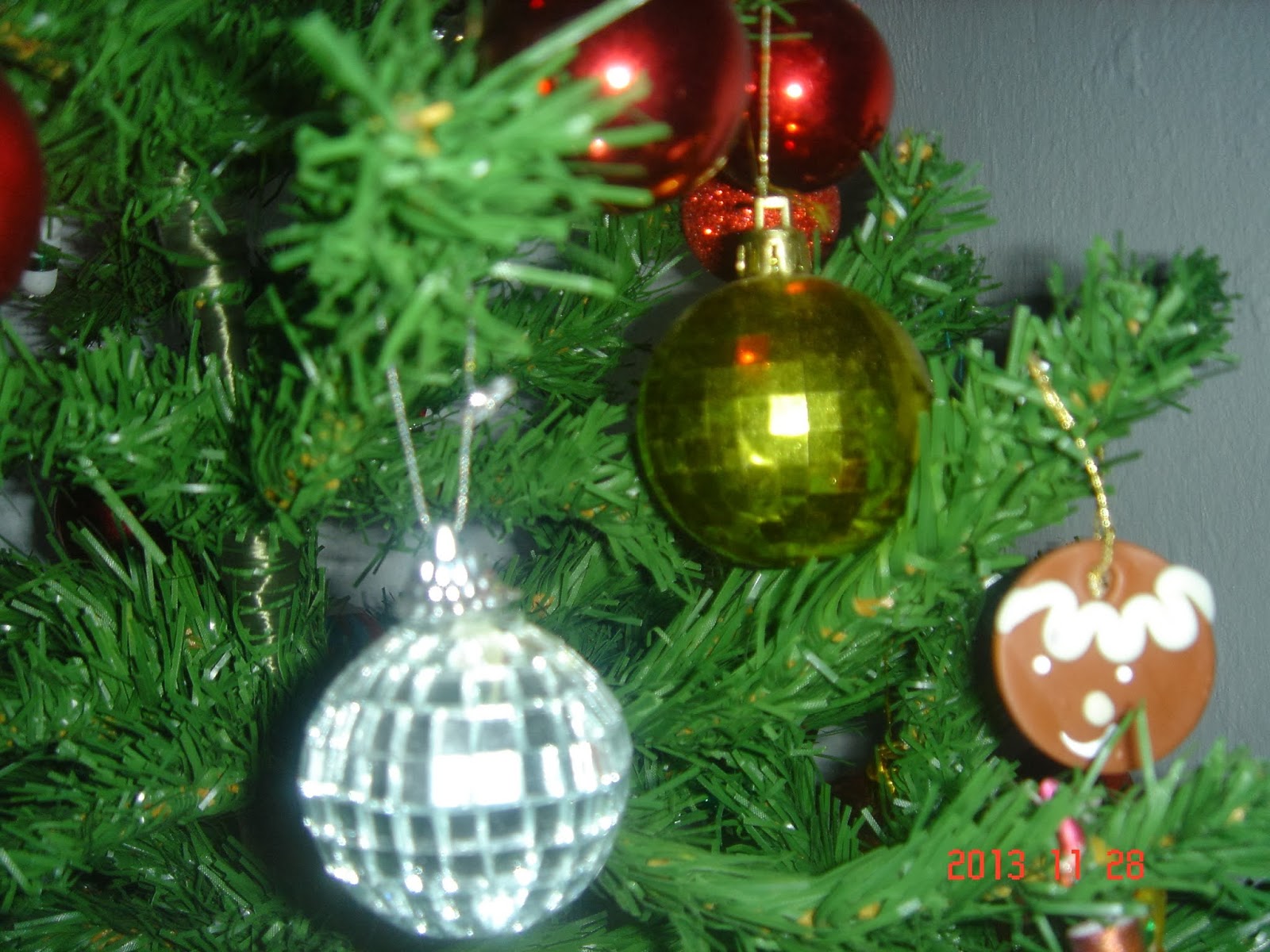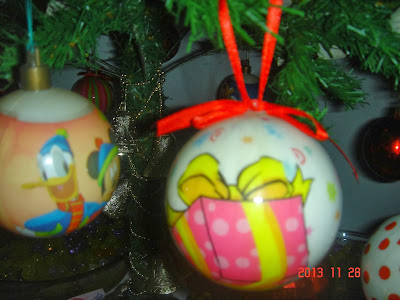 Bolas novas esse ano, algumas vermelhas pequenas e essas grandes decoradas