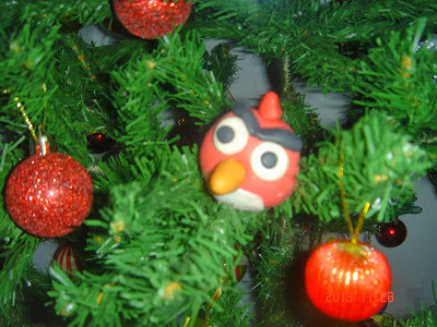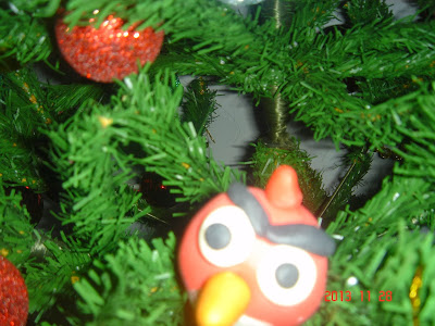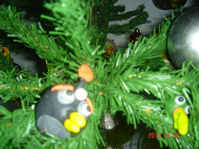 Angry Birdys em biscuit, escondidos entre os galhos da árvore, todos em biscuit, obra da Raquel ano passado