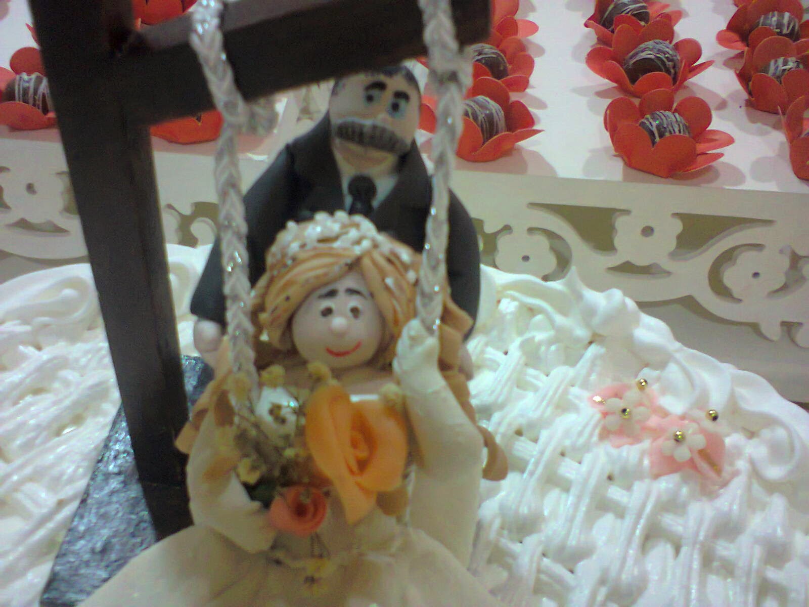 Mesa do bolo, com arranjos em biscuit