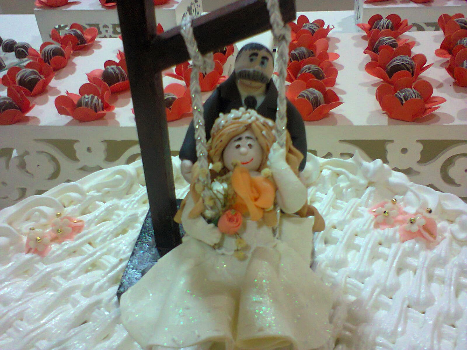 Mesa do bolo, com arranjos em biscuit