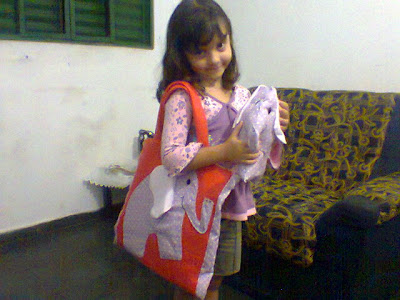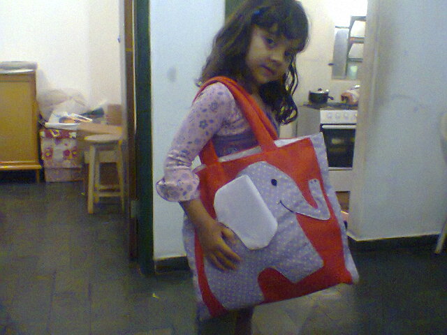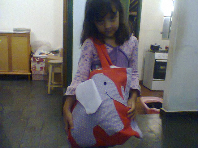 A bolsa e o elefante foram feitos sob medida, pois cada dia um aluno leva o mascotinho para casa.