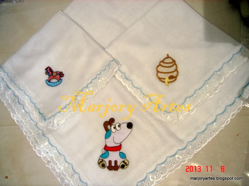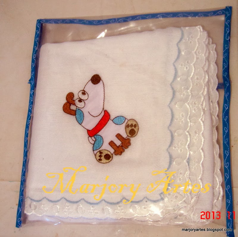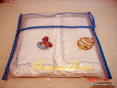 O kit com três fraldas: 1 grande de 70×70 cm e duas de 33x33cm, ficaram bem nessa embalagem transparente e sob medida.