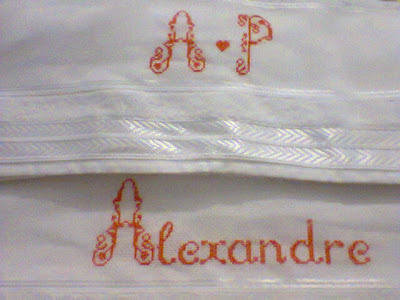 Baseada nessa conversa, fiz esse saquinho de cetim, (a fita da mesma cor do bordado identifica qual o jogo sem ter de abrir), para guardar e proteger esse jogo de toalhas.