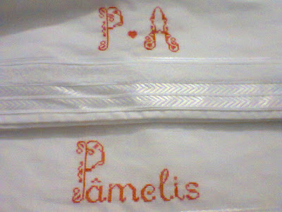 Baseada nessa conversa, fiz esse saquinho de cetim, (a fita da mesma cor do bordado identifica qual o jogo sem ter de abrir), para guardar e proteger esse jogo de toalhas.