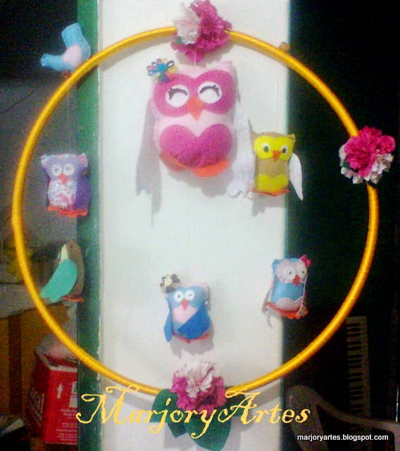 Móbile de corujinhas, em bambolê. Serão colocadas na sala de aula dos pequeninos da Mércia, professora da minha Raquel, e amiga. Obrigada amiga. Obrigada Senhor.