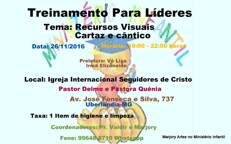 Muitos que começaram os treinamentos não estão vindo, devido principalmente a compromissos, e esse extra vamos ter a ajuda da irmã Joelia que vai fazer uma transmissão ao vivo pelo face, assim poderemos alcançar irmãos que mesmo longe estão caminhando junto nesse propósito de ensinar as crianças NO Caminho.